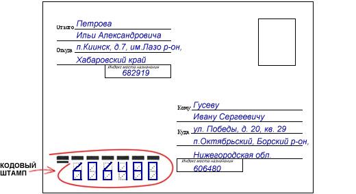 Please note that on letters and postcards with a code stamp, the addressee's postal code is filled in with stylized numbers in ink of any color except red, yellow, and green.